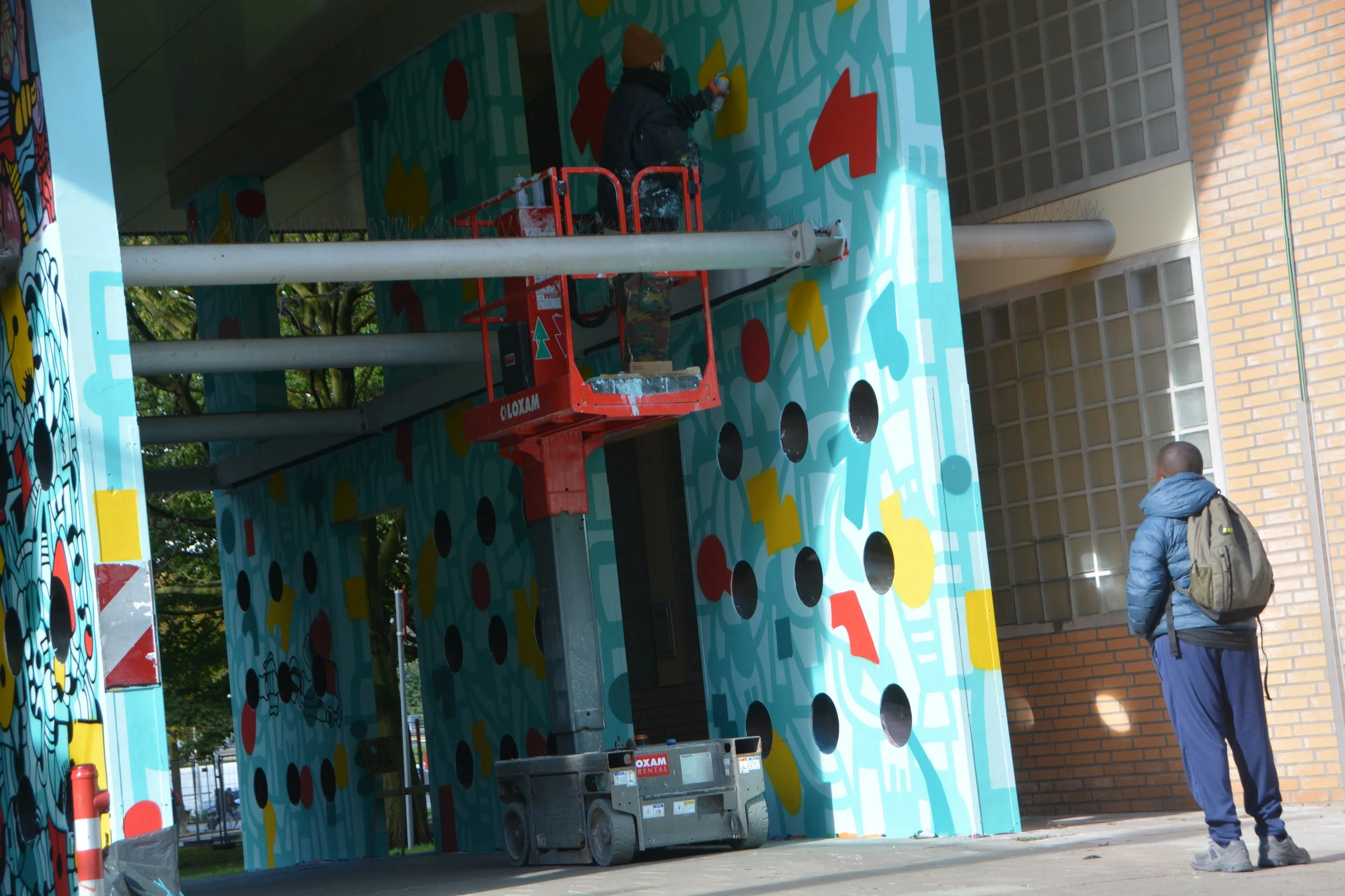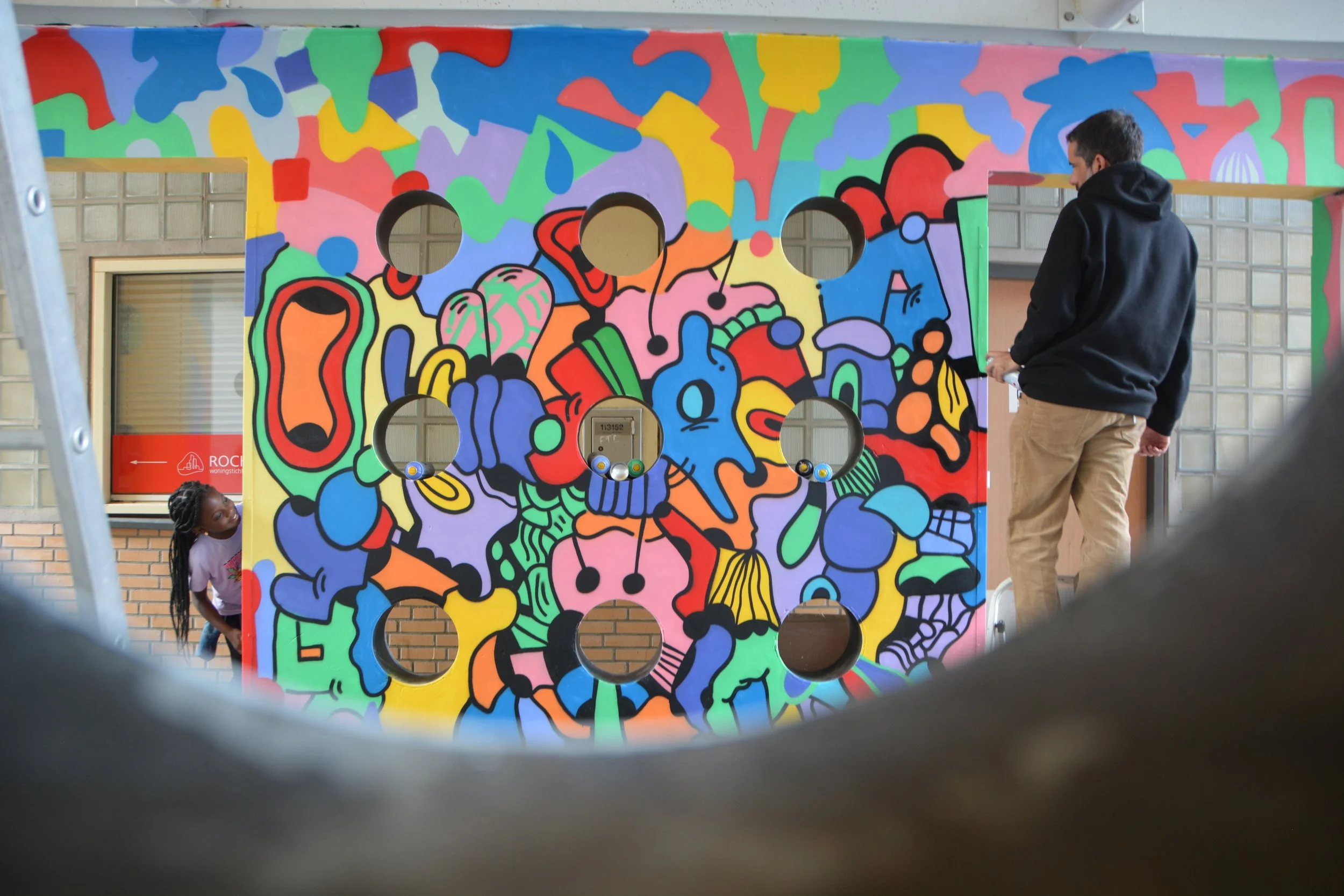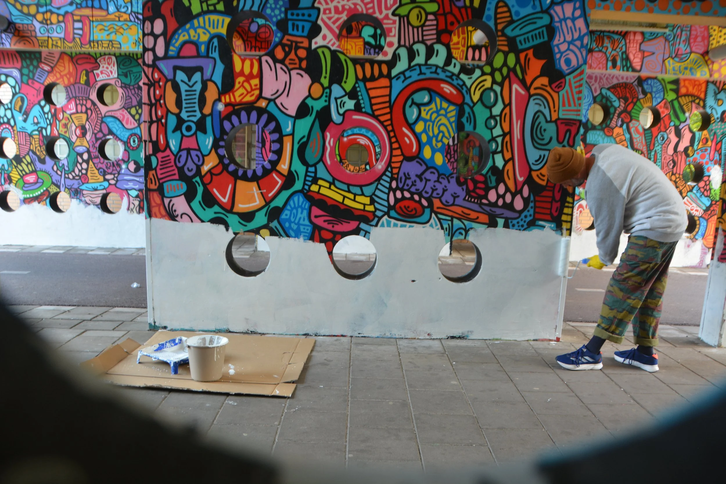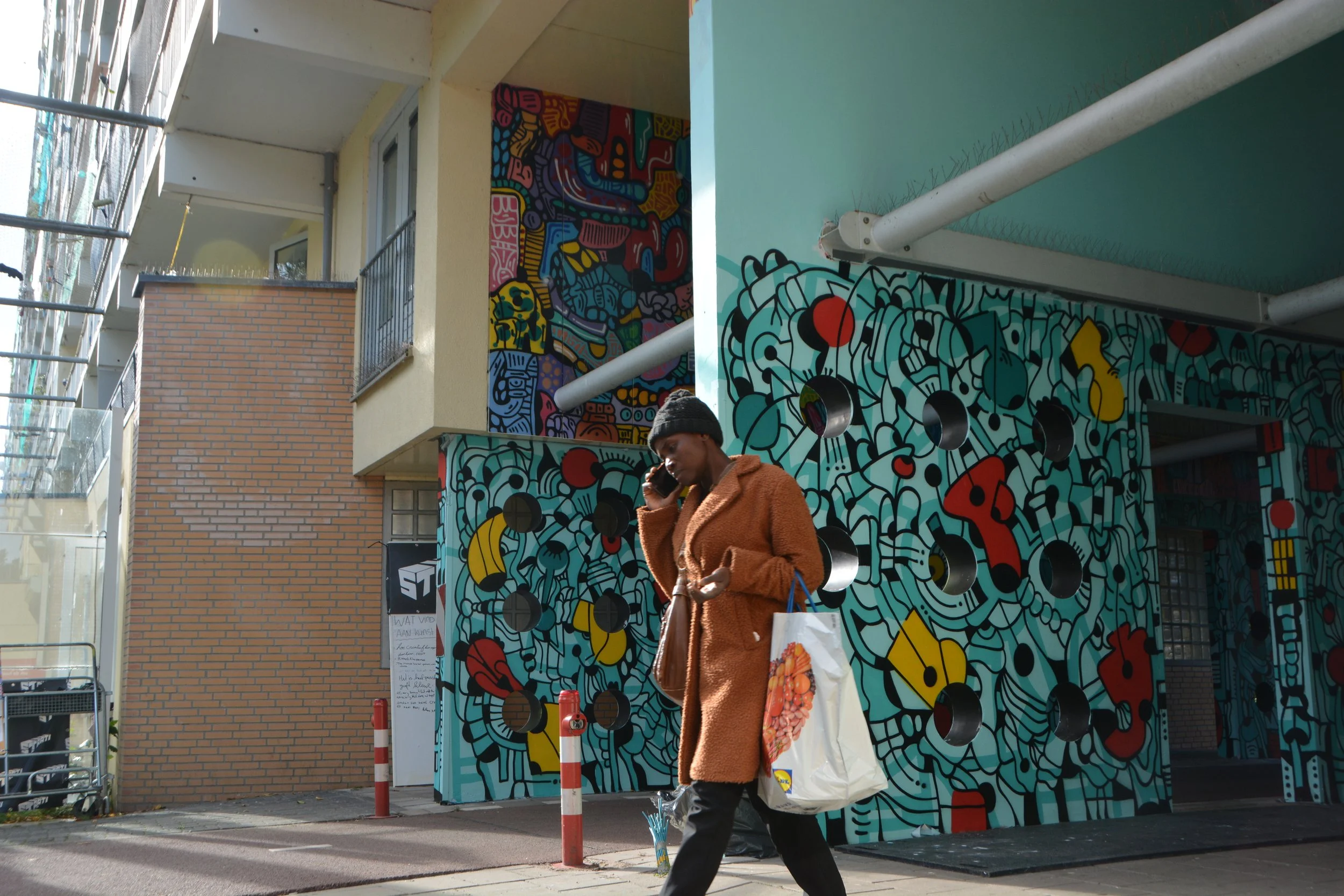 Onio's previous mural became a popular backdrop for photoshoots by creatives from Southeast, and we’re incredibly grateful for the love and support it received. Unfortunately, the original artwork was damaged. Since our crew member lives in the flats of the H-buurt, we reached out to Onio again to keep his art in the neighborhood. In September 2024, he painted an amazing new mural on Hofgeest.